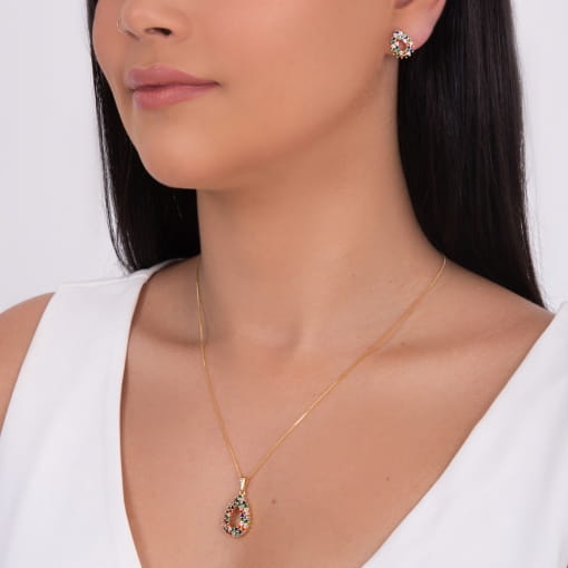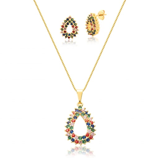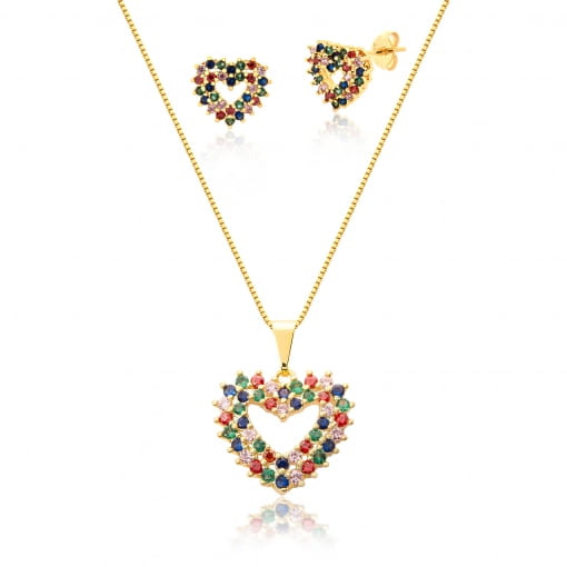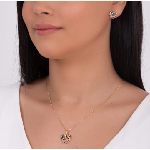 Conjunto com brinco e pingente coração com zircônias coloridas