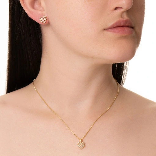 Conjunto brinco e pingente folheado design coração com pedrinhas