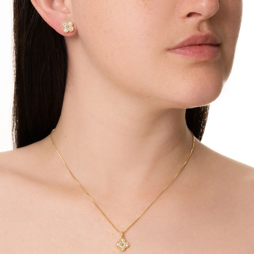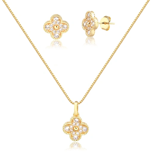 Conjunto folheado brinco e pingente trevo 4 folhas com zircônias