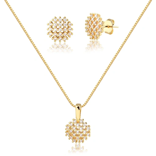 Conjunto folheado brinco e pingente redondo zircônias espaçadas