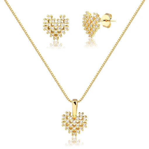 Conjunto folheado brinco e pingente coração zircônia espaçadas