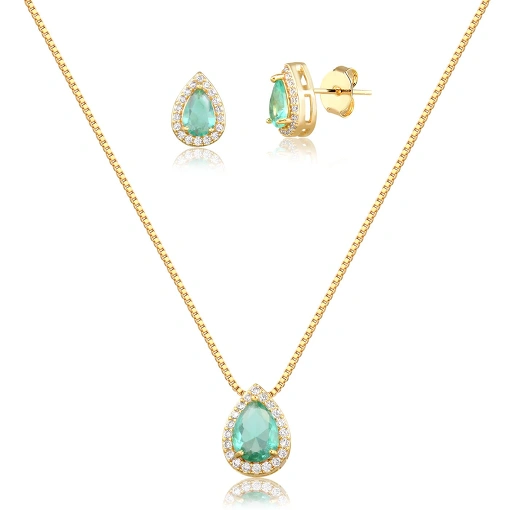 Conjunto folheado brinco e pingente gota com zircônia cor verde