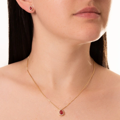 Conjunto folheado brinco e pingente gota com zircônia cor rosa